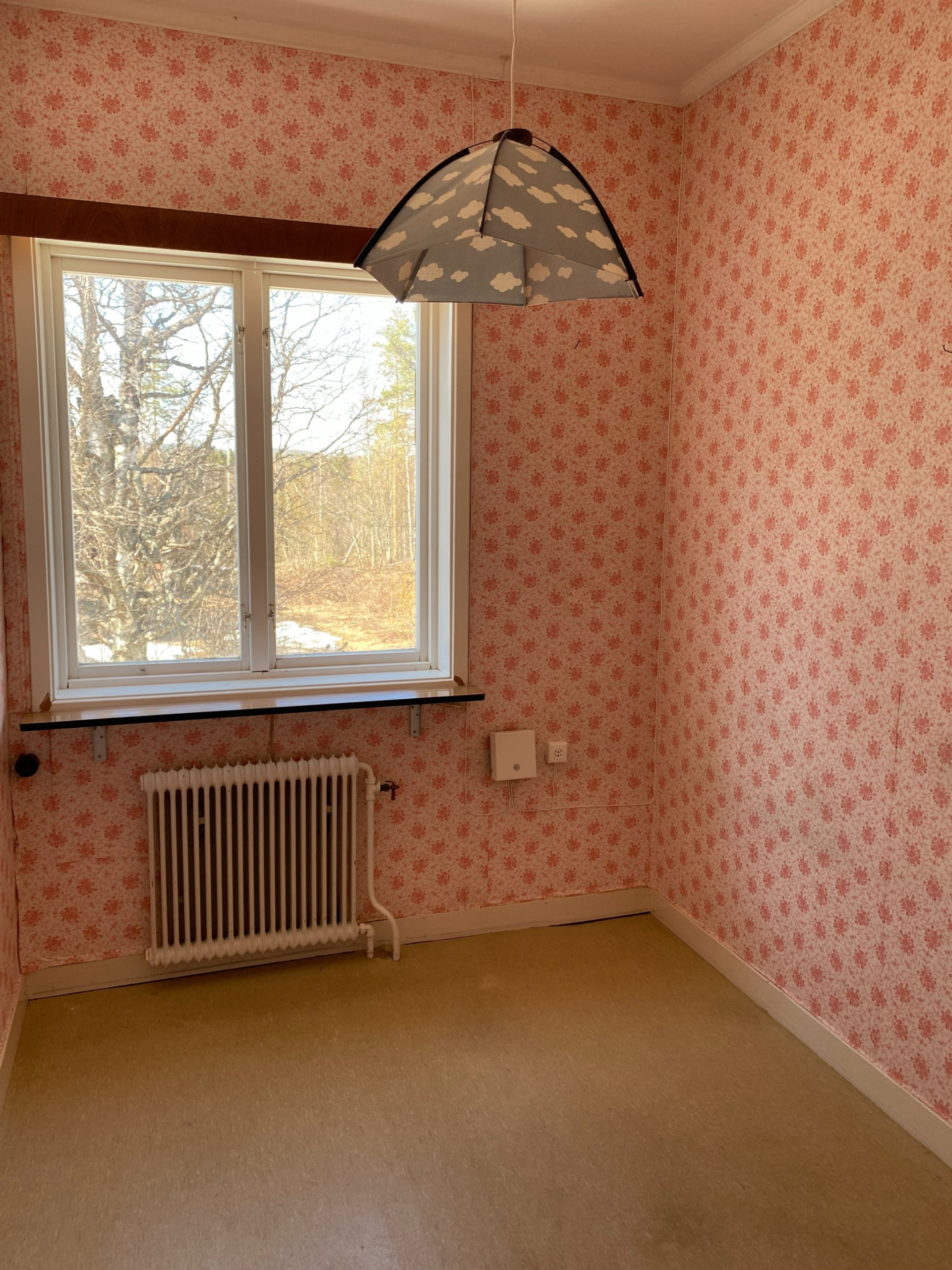 Övre våning med halll, stort allrum (fd kök) samt 2 sov, ett större och ett mindre, wc med tvättställ.