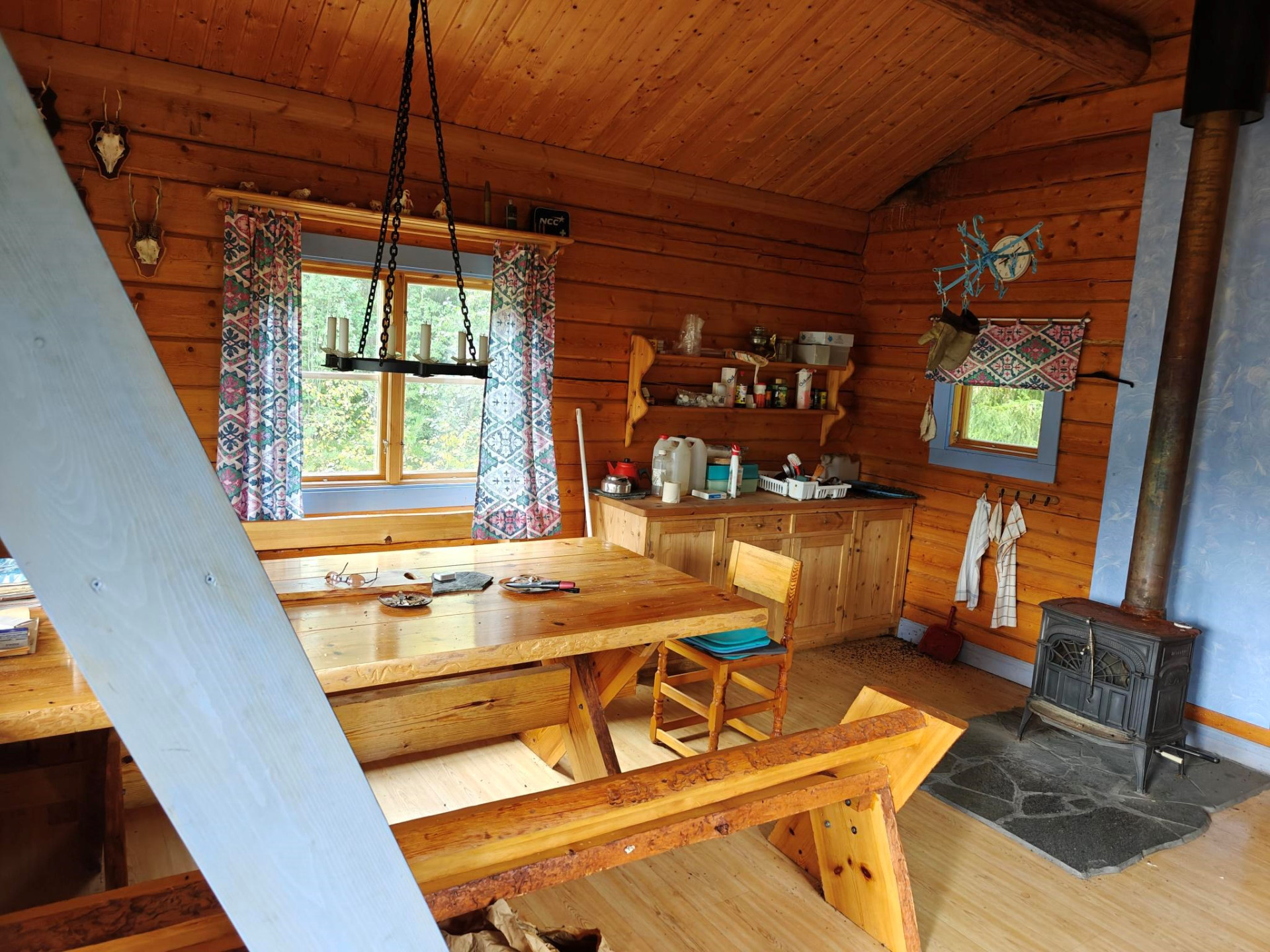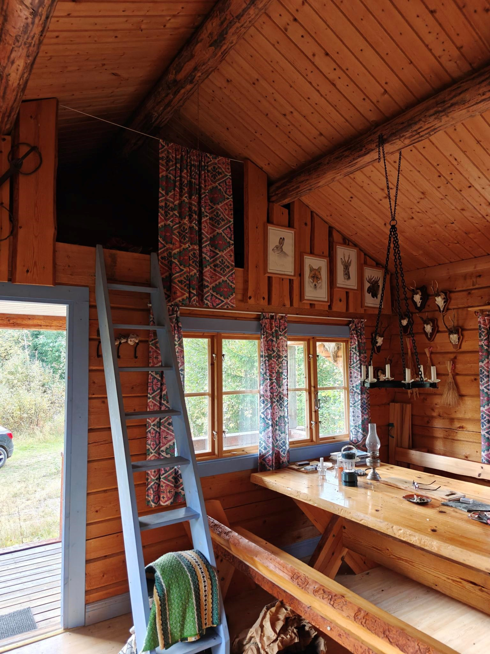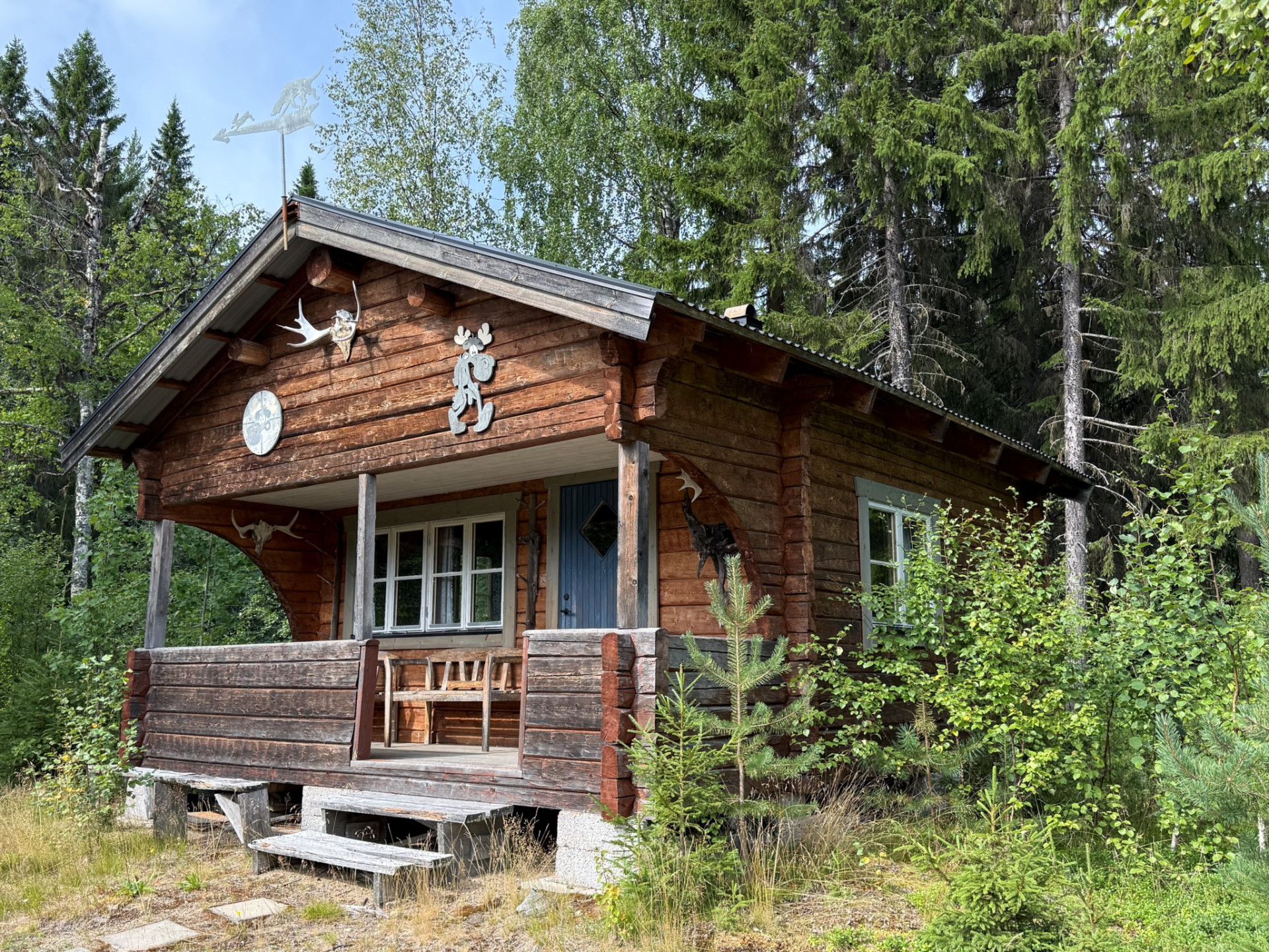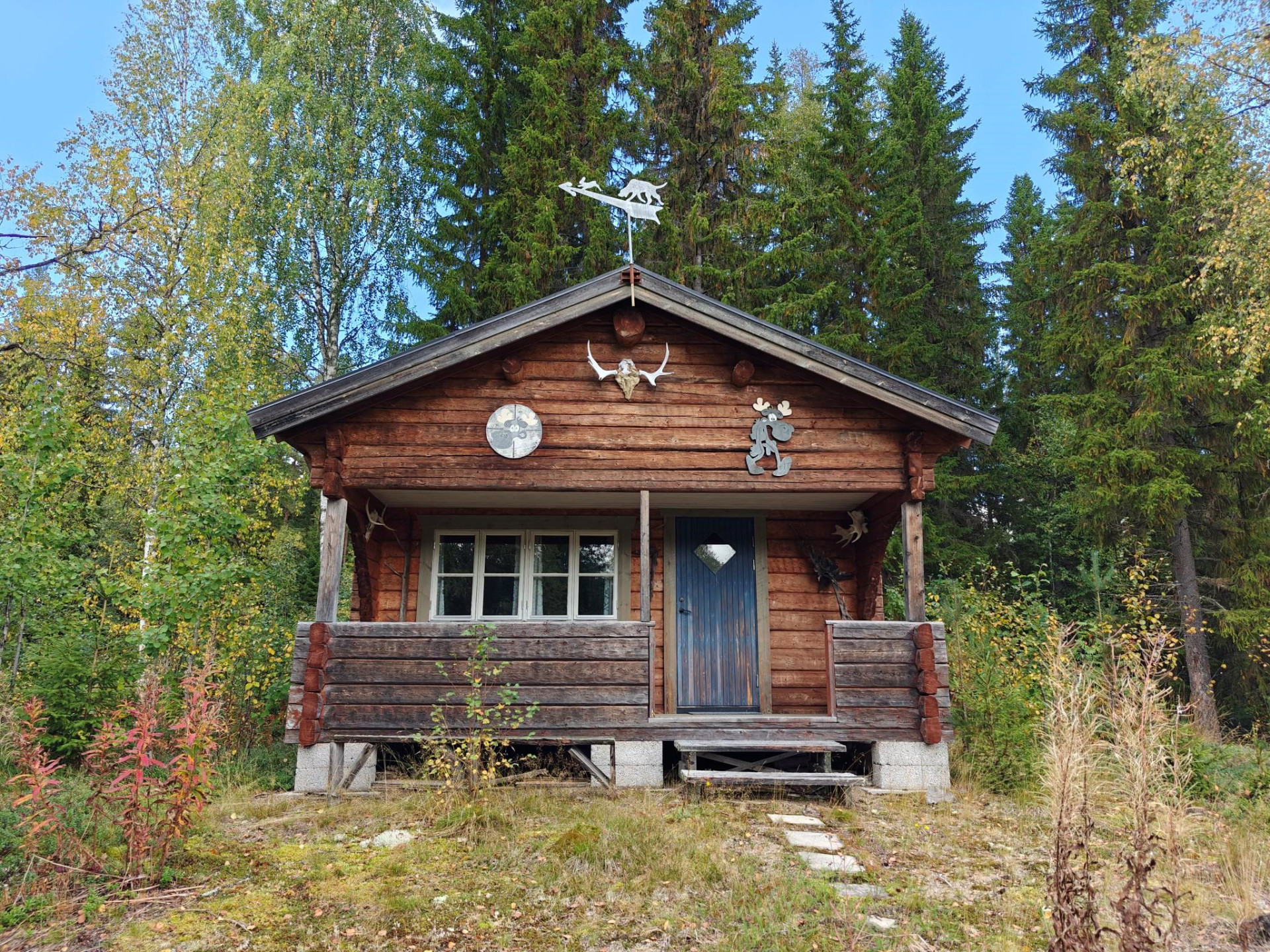 Det ingår en timrad skogskoja nere vid Lögdeälven som kan nyttjas för övernattning i vacker vildmarksmiljö.